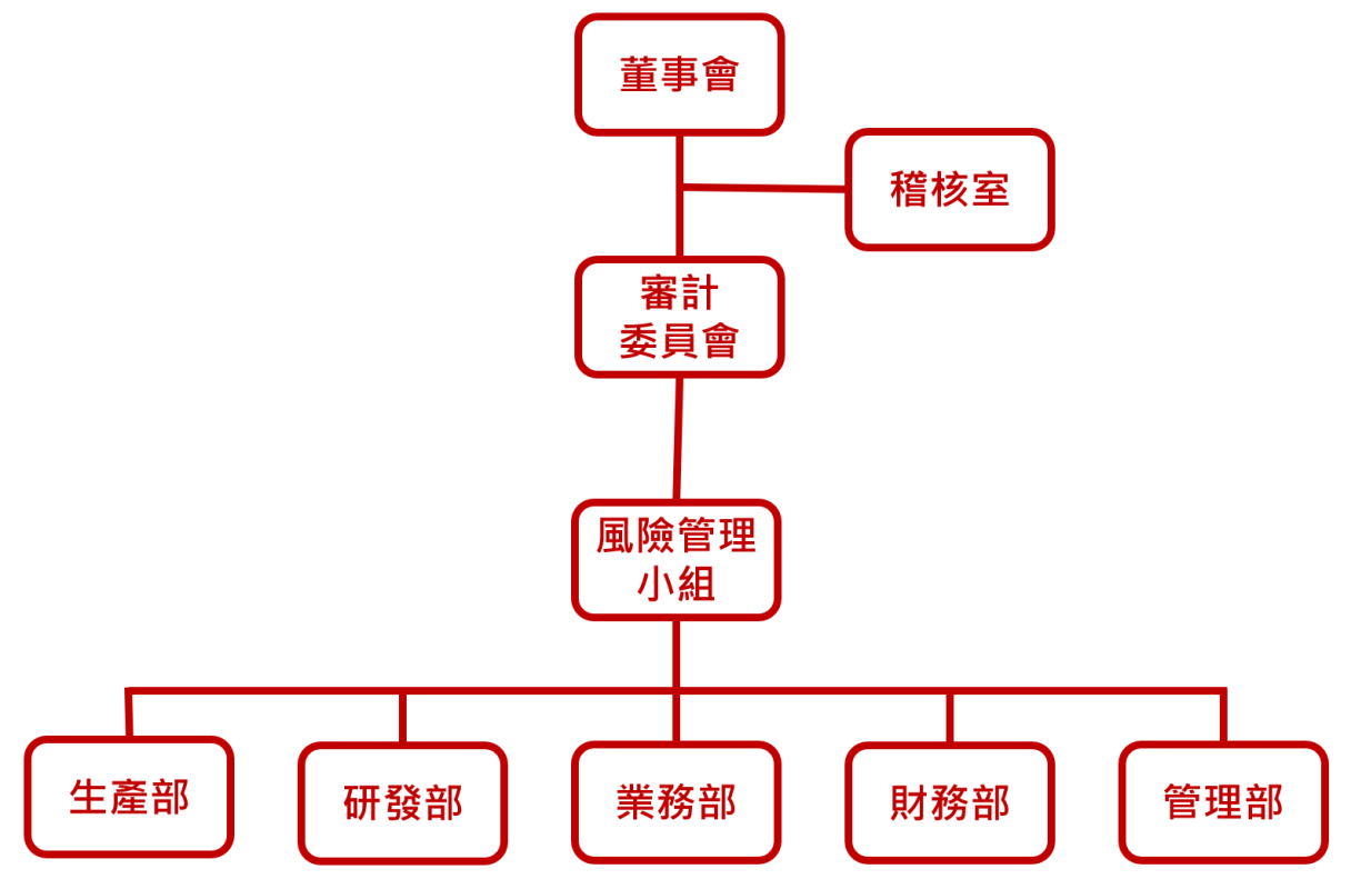| 審計委員會 | 督導風險單位,下設風險管理小組,由總經理負責統籌並監督整體風險管理之執行、協調運作及應變指揮。 |
